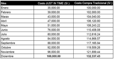 Con el sistema JIT, el costo acumulado aumenta de manera escalonada a medida que se adquieren los uniformes mes a mes. El mayor aumento se observa en enero (35%) y junio (25%), los meses pico de demanda en el caso de estudio. El costo final a diciembre es de S/. 100,000.00.