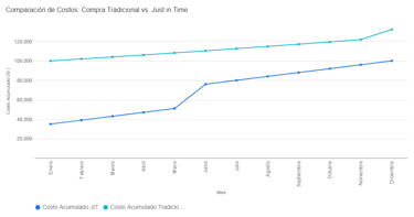 El gráfico ilustra la diferencia en los costos acumulados a lo largo del año. La línea azul representa el sistema Just-in-Time (JIT), mientras que la línea verde corresponde a la compra tradicional.